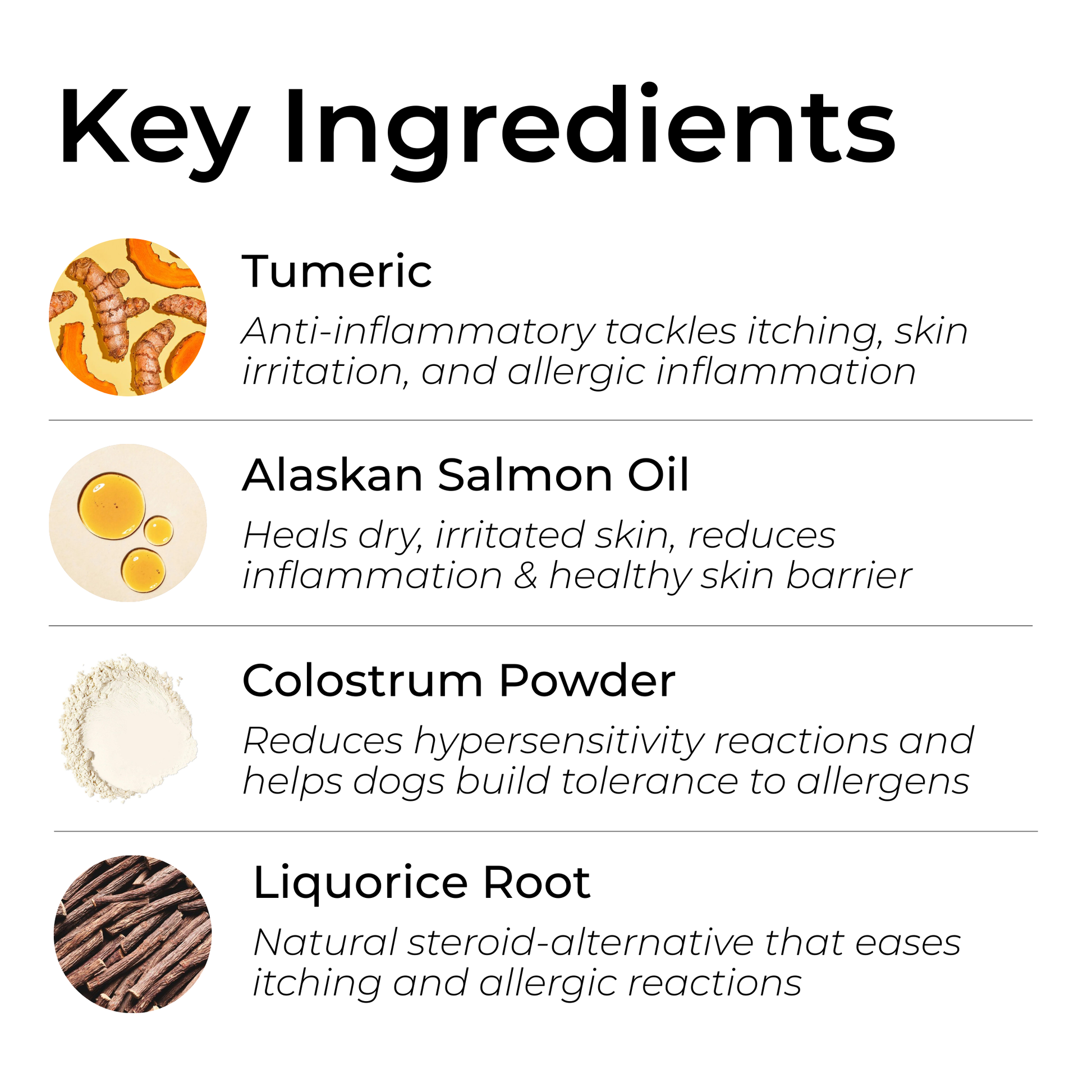 Petrition Allergy and Itch Support Chews are formulated with a blend of natural ingredients that collectively work to reduce allergy symptoms in dogs. Colostrum powder enhances immune function, reducing hypersensitivity reactions to allergens. Turmeric's anti-inflammatory properties alleviate itching and soothe skin irritation, while pumpkin powder supports digestive health, aiding nutrient absorption crucial for immune balance. Alaskan salmon oil contributes omega-3 fatty acids that maintain healthy skin and mitigate inflammatory responses triggered by allergies. Apple cider vinegar provides antimicrobial benefits to alleviate skin irritations and maintain pH balance. Organic honey offers antioxidants and anti-inflammatory properties, helping soothe allergy-related symptoms. Evening primrose oil's gamma-linolenic acid aids in inflammation reduction and supports skin health. Licorice root acts as a natural anti-inflammatory, easing itching and allergic reactions, while bee pollen boosts immune function and offers anti-inflammatory benefits, collectively addressing allergic reactions comprehensively to promote overall well-being in dogs.