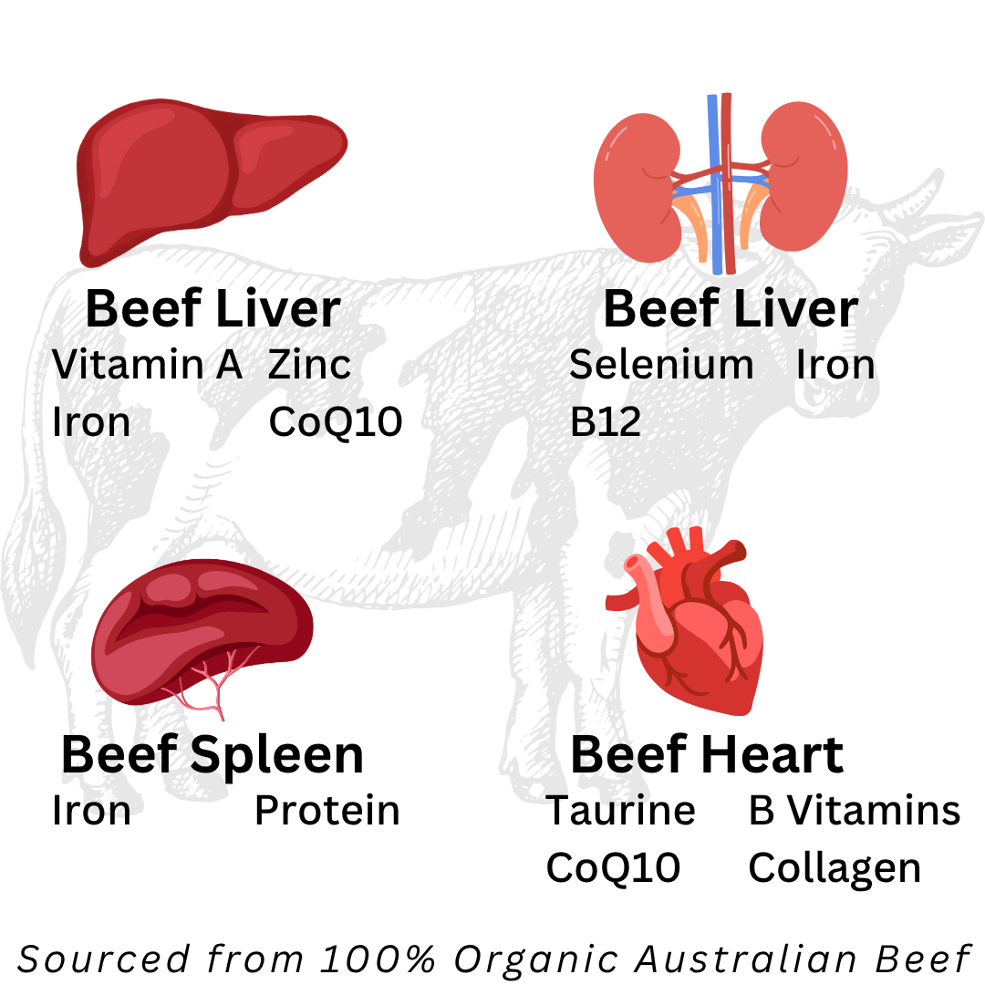 Whole-Body Nutrition Our blend of beef liver, heart, spleen, and kidney provides a powerhouse of essential vitamins, minerals, and amino acids—supporting energy, immunity, skin, coat, and joint health.