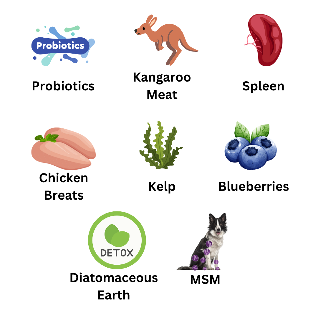 Kangaroo, chicken, spleen, natural probiotics (multi-strain blend). No fillers, binders, or preservatives.