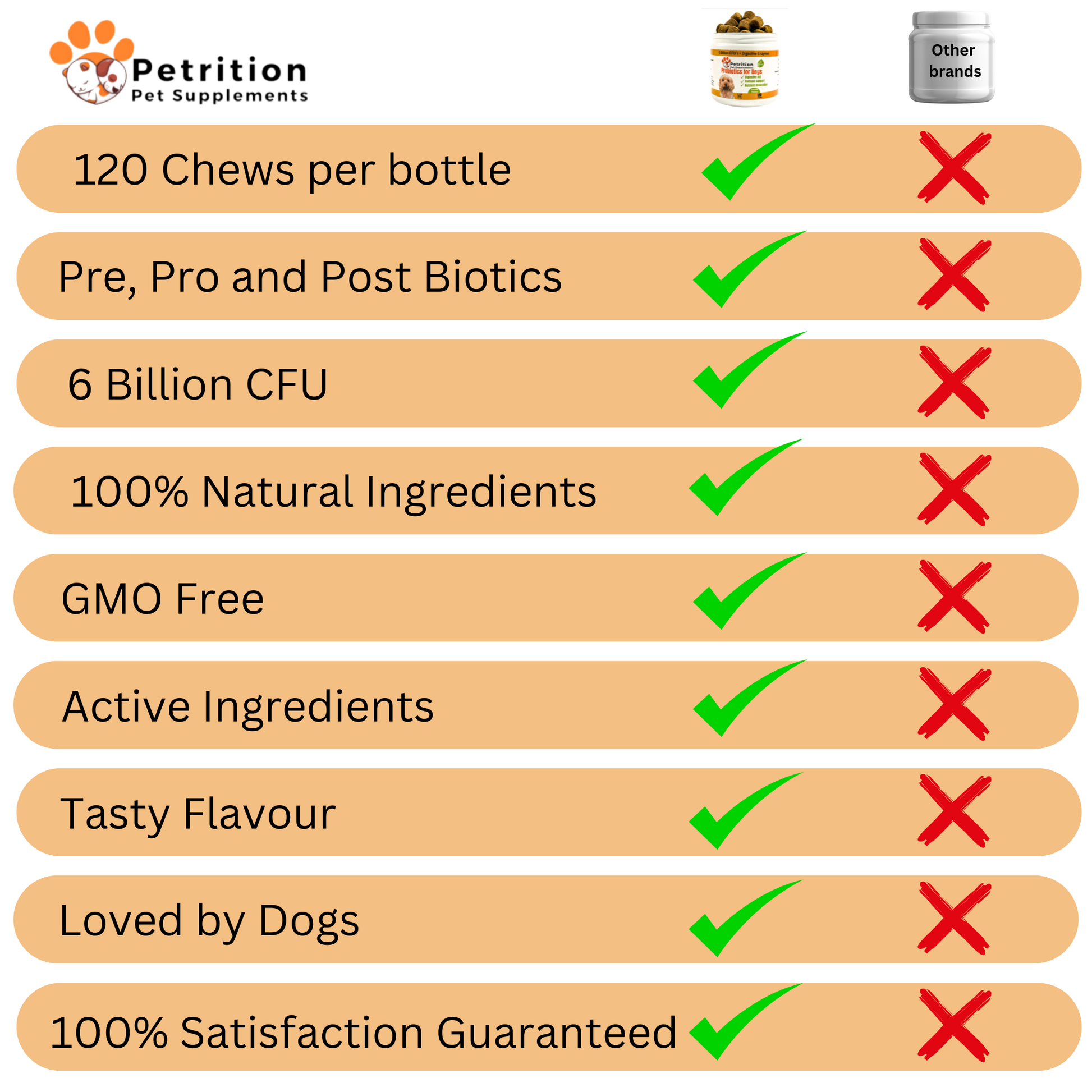 Petrition Probiotic Support promotes digestive health in dogs with 6 Billion CFU's and probiotics for gut flora balance, Apple Cider Vinegar for enzyme activity, Papaya Juice enzymes for food breakdown, and Krill Oil's omega-3 for anti-inflammatory benefits, collectively enhancing digestion and overall gastrointestinal function.