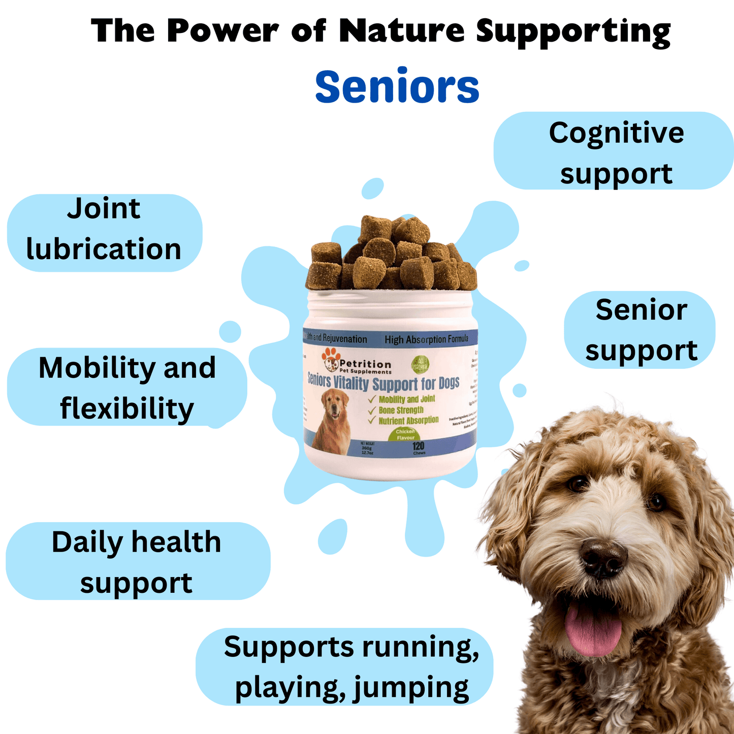 Petrition Seniors Support incorporates comprehensive wellness in aging pets by supporting joint mobility, skin health, immune function, and overall vitality. They contribute to reducing inflammation, enhancing cellular energy, providing antioxidant protection, and maintaining healthy joints and coat, ensuring senior pets stay active and healthy as they age.