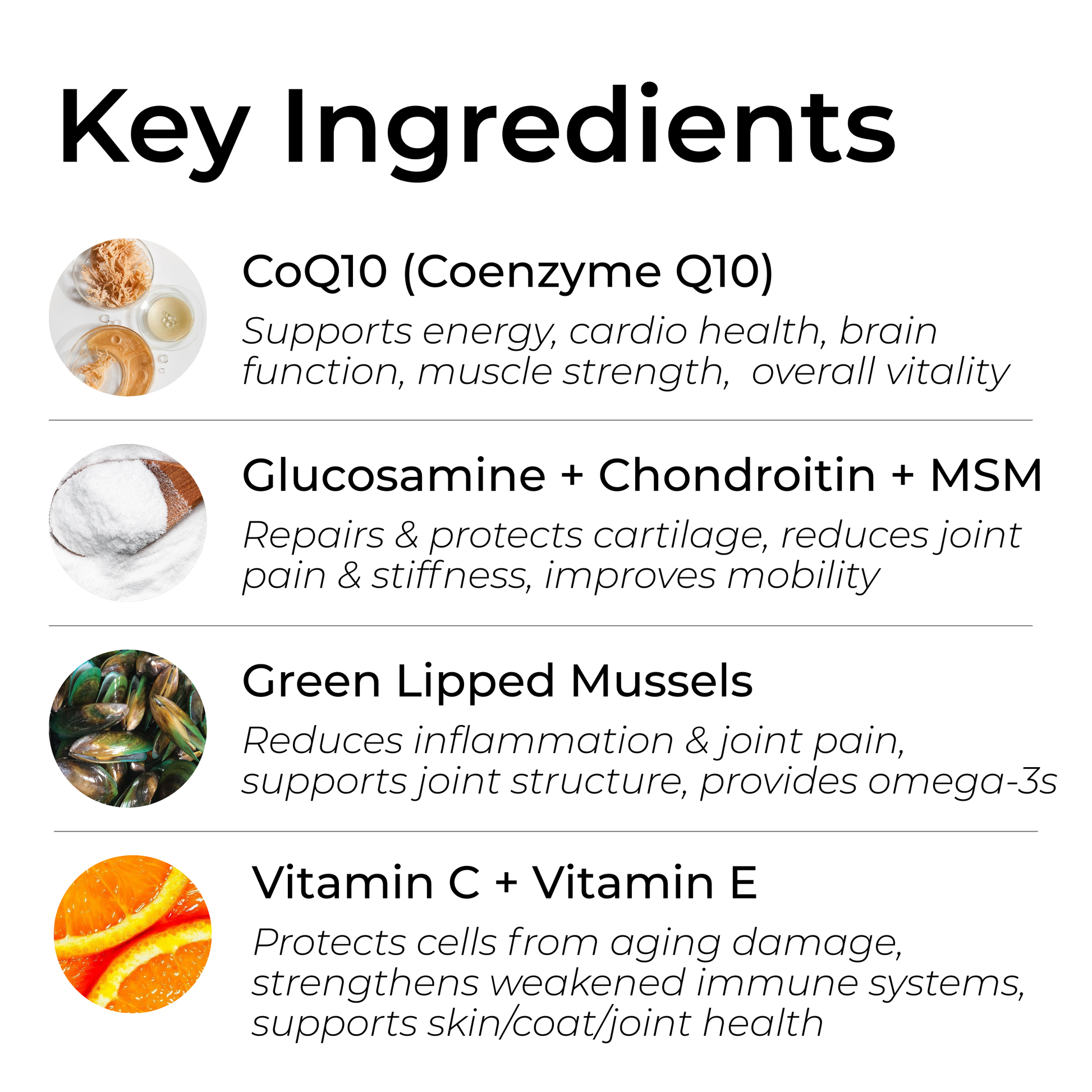 Coenzyme Q10 acts as an antioxidant, protecting cells and supporting immune function, while Vitamin C enhances immune response and aids in fighting infections. Together, they strengthen the immune system, helping dogs stay healthy and resilient.